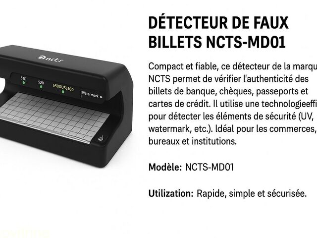 Compact et fiable, ce détecteur de la marque NCTS permet de vérifier l'authenticité des billets de banque, chèques, passeports et cartes de crédit. Il utilise une technologie efficace pour détecter les éléments de sécurité (UV, watermark, etc.). Idéal pour les commerces, bureaux et institutions.